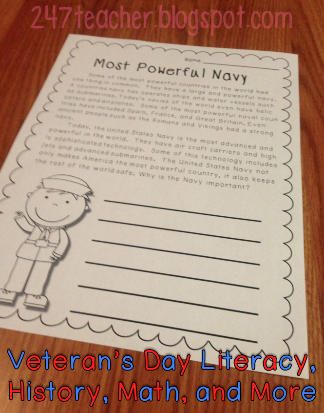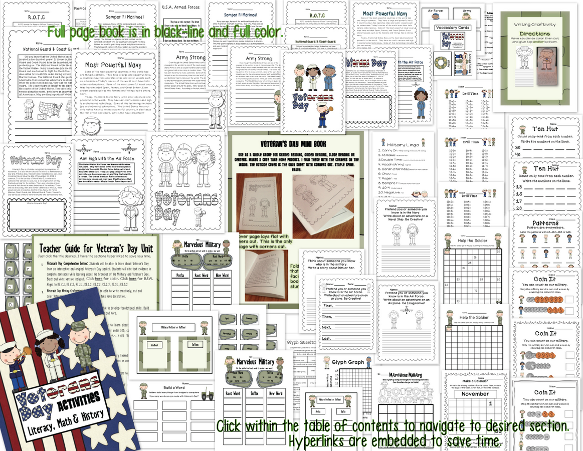 Spread over 110 pages you will find differentiated math to include addition, subtraction, multiplication, filling in a 100's chart, making a calendar, counting coins, and more. You will also find activities for foundational skills such as prefixes, suffixes, word sorts, and a building words with dog tags center. Differentiated writing prompts and passages for Close Reading about the Army, Navy, Air Force, Marines, and of course Veteran's Day. One mini-book and one full page book. The full page is in color and black line. A simple glyph, vocabulary cards, and classroom decor will certainly help recognize this significant holiday.